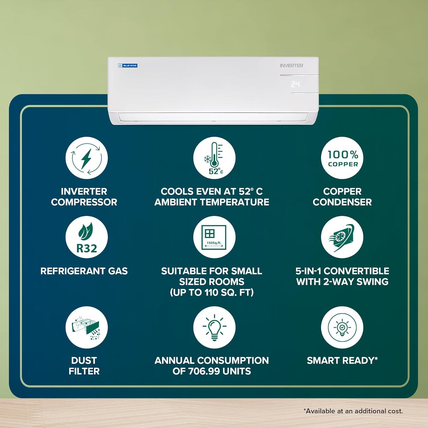 - 5-in-1 Convertible Cooling: Unique 5-in-1 cooling mode to run your AC at 5 different capacities as per the desired comfort. It comes in combination of 2 buttons in the remote. Split AC with inverter compressor: Variable speed compressor which adjusts power depending on heat load.