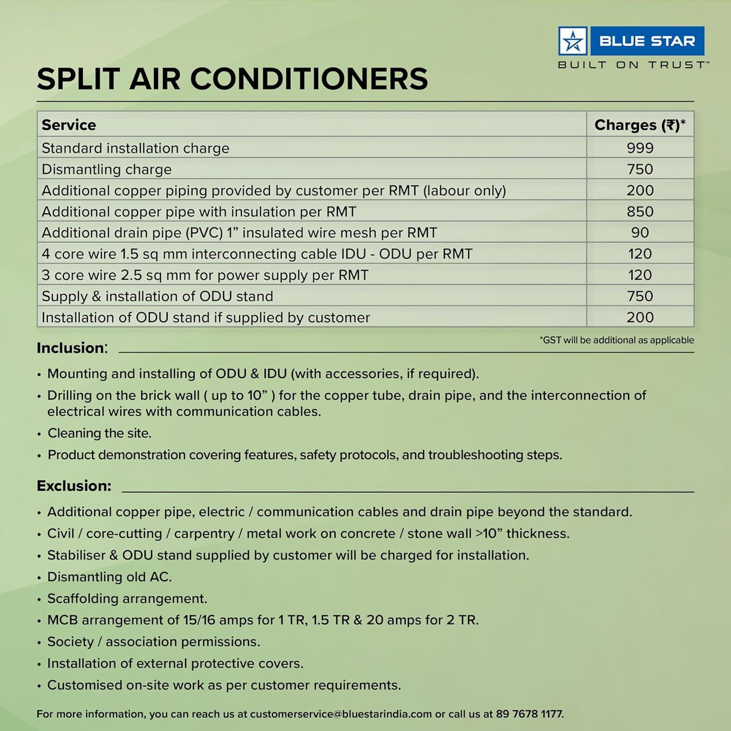 - Manufacturer Warranty: 1 Year on Product, 5 Years on PCB, 10 Years on Inverter Compressor(T&C*).Standard Warranty means ‘Repair/Replacement’ of any part of the AC found defective, subject to the confirmation of the technical personnel of Blue Star/Authorised service dealers/service associates, due to faulty material or workmanship. Excludes all types of air filters, plastic and metal parts, remote handset & gas charging.Gas charging associated with Compressor/Evaporator/Condenser coil to be paid by customer. This applies to residential usage only.
